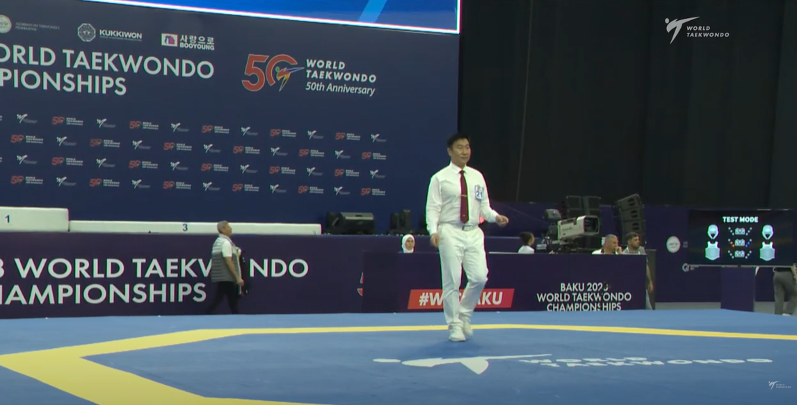 협회장님은 세계 태권도선수권대회에 심판으로 참여하고 계십니다.